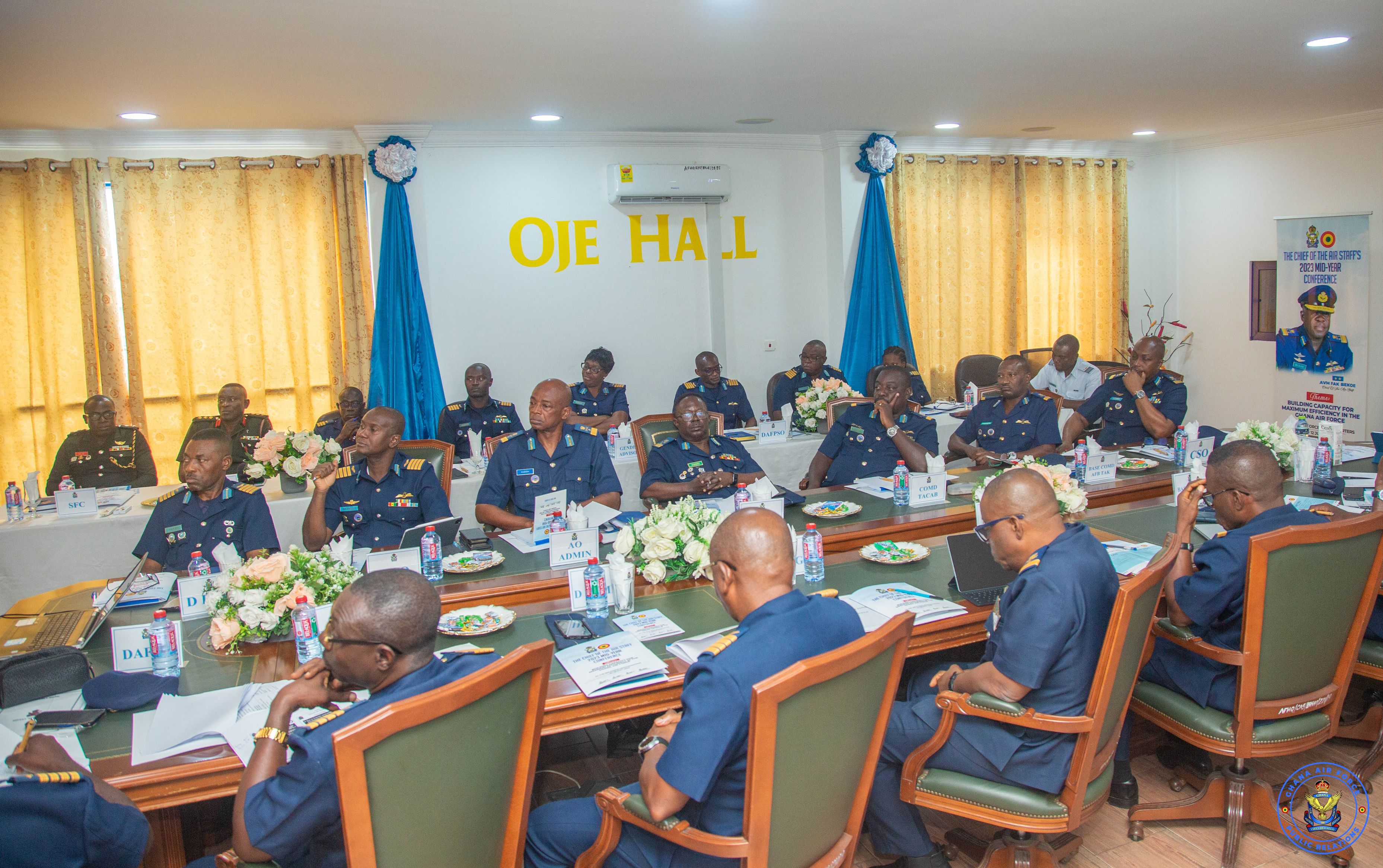 The Chief of the Air Staff (CAS), Air Vice Marshal (AVM) Frederick Asare Kwasi Bekoe has held his maiden Mid-Year Conference at the Air Force Headquarters (AFHQ) from Tuesday 11 July to Wednesday 12 July 2023. The conference organised under the theme ‘Building Capacity for Maximum Efficiency in The Ghana Air Force’ brought together the Chief Staff Officer, Base Commanders, Air Officers and Directors at the AFHQ to deliberate on pertinent issues confronting the Ghana Air Force and proffer strategic solutions.